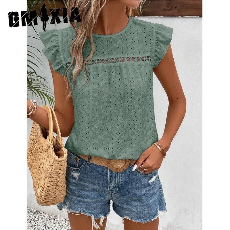GMXIA Women's Fashion Casual Leisure Summer Solid Color Print Short Sleeve O-Neck Blouses & Shirts