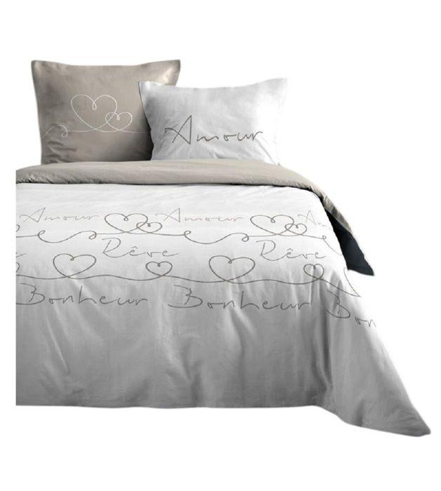 Housse de couette + taies - Mot d'Amour - 240x260cm - 100% coton - Gris