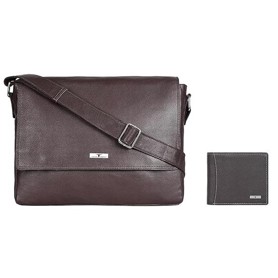 URBAN FOREST Chocolate Brown Leather Messenger Bag & Dark Brown Leather Wallet for Men
