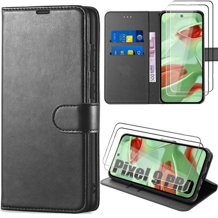 Coque et 2 Verres Trempés pour Google Pixel 9 Pro, Anti-Rayures Porte-Carte Synthécuir Souple - Noir