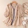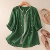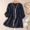 Dieses stilvolle Hemd, gefertigt aus einer weichen Baumwoll-Leinen-Mischung, hat einen klassischen V-Ausschnitt und halblange Ärmel für einen vielseitigen, retro-inspirierten Look.. Entworfen mit einer lockeren Passform, bietet es eine lässige, aber dennoch schicke Silhouette, die sowohl bequem als auch schmeichelhaft ist.. Die aufwendige Stickerei verleiht einen Hauch von Eleganz und macht es zu einer perfekten Wahl für diejenigen, die eine altersreduzierende und zeitlose Ergänzung für ihre Garderobe suchen.