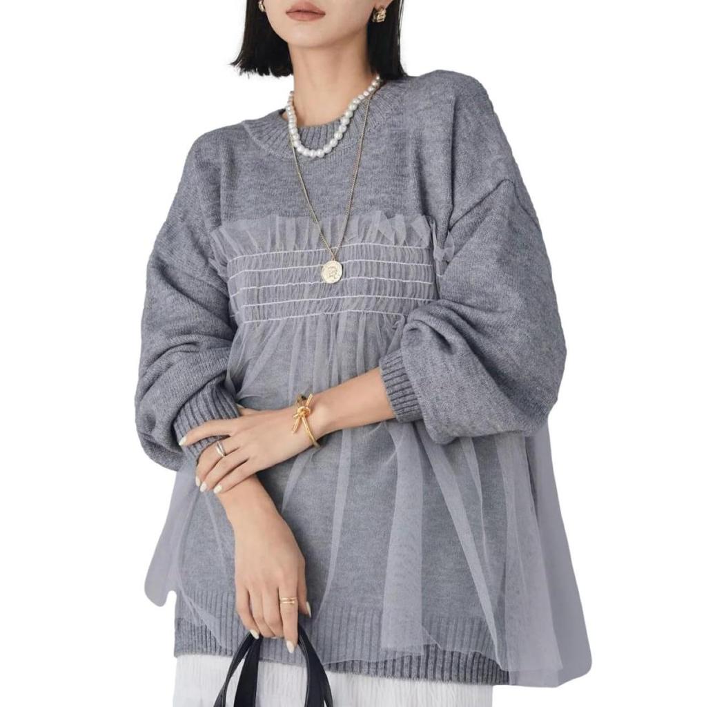 Tulle docking knit pullover for long round loose voluminous tunic beautiful cute for autumn winter tulle body loose women, sleeves, neck, fit,