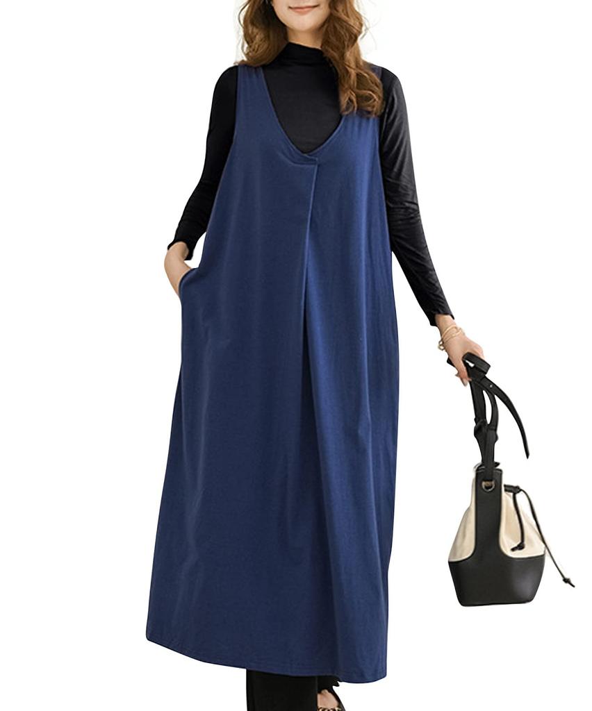 Made of smooth and soft material that is light and comfortable to wear. The soft and natural material creates a relaxed line that creates an adult resort feel. The wide V-neck shows off a clean look around the face. Since it is sleeveless, you can wear it beautifully with any innerwear without it being bulky. It is a very feminine dress that is loose but not too casual. Another nice point is that it has deep pockets on both sides. It is recommended as maternity wear for pregnant women as it can be worn comfortably without feeling tight. The fabric is moderately thin, so you can wear it regardless of the season, such as when going out or indoors.