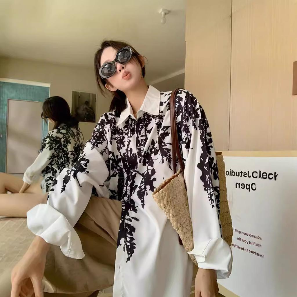 Herbst Retro Locker Lässiges Hemd für Damen Tintendruck Lange Ärmel Neues Nischen Temperament Design Schickes Oberteil