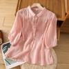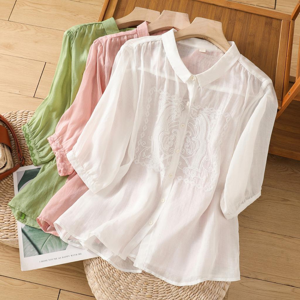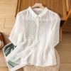 Lockeres und leichtes atmungsaktives Baumwoll- und Leinenhemd für Damen Sommer neu Polokragen Siebenviertelärmel besticktes Temperament-Oberteil