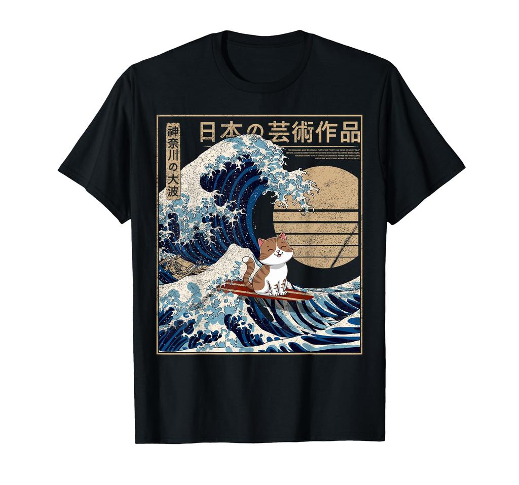 Celebrate your love of Japanese culture with this funny "Cat Surfing Big Wave Off Kanagawa" design. Perfect for fans of anime, manga, and Japanese Harajuku streetwear. Kanagawa Wave Japanese tattoo art graphics, otaku anime clothing.