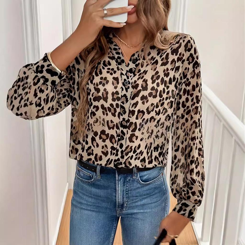 JKASHDK Damenmode Casual Frühling Herbst Leopardenmuster Langarm V-Ausschnitt Blusen & Hemden