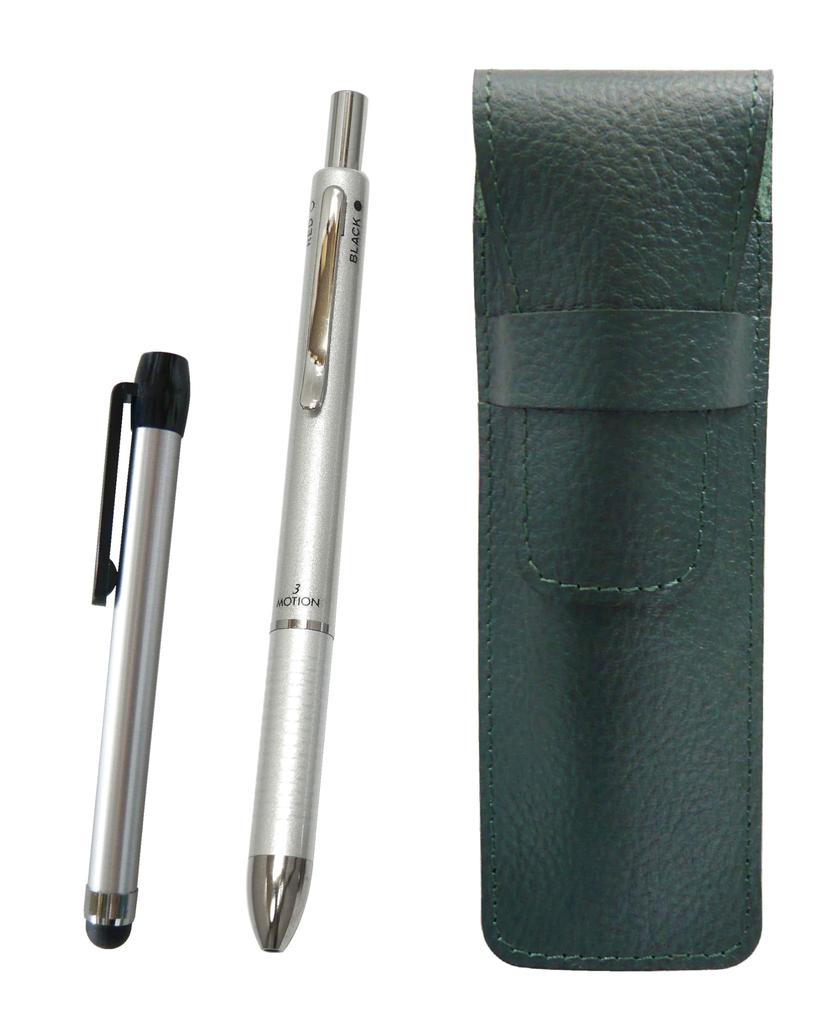 Moss green grained leather pen metal touch silver stick and silver set case, 3-mecha SASMG-ALST-3MS