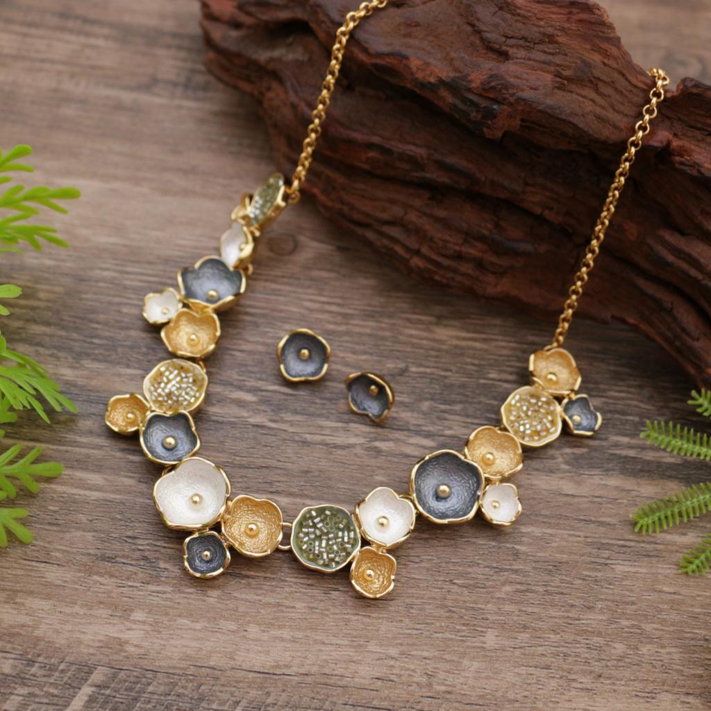 Yellow painting oil geometric flower stud earrings necklace set, stylish and simple women's versatile flower necklace