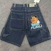 RogueWave Y2K Jeansshorts Herren Harajuku Hip Hop Cartoon Stickerei Blau Baggy Denim Lässig Knielang Kurz