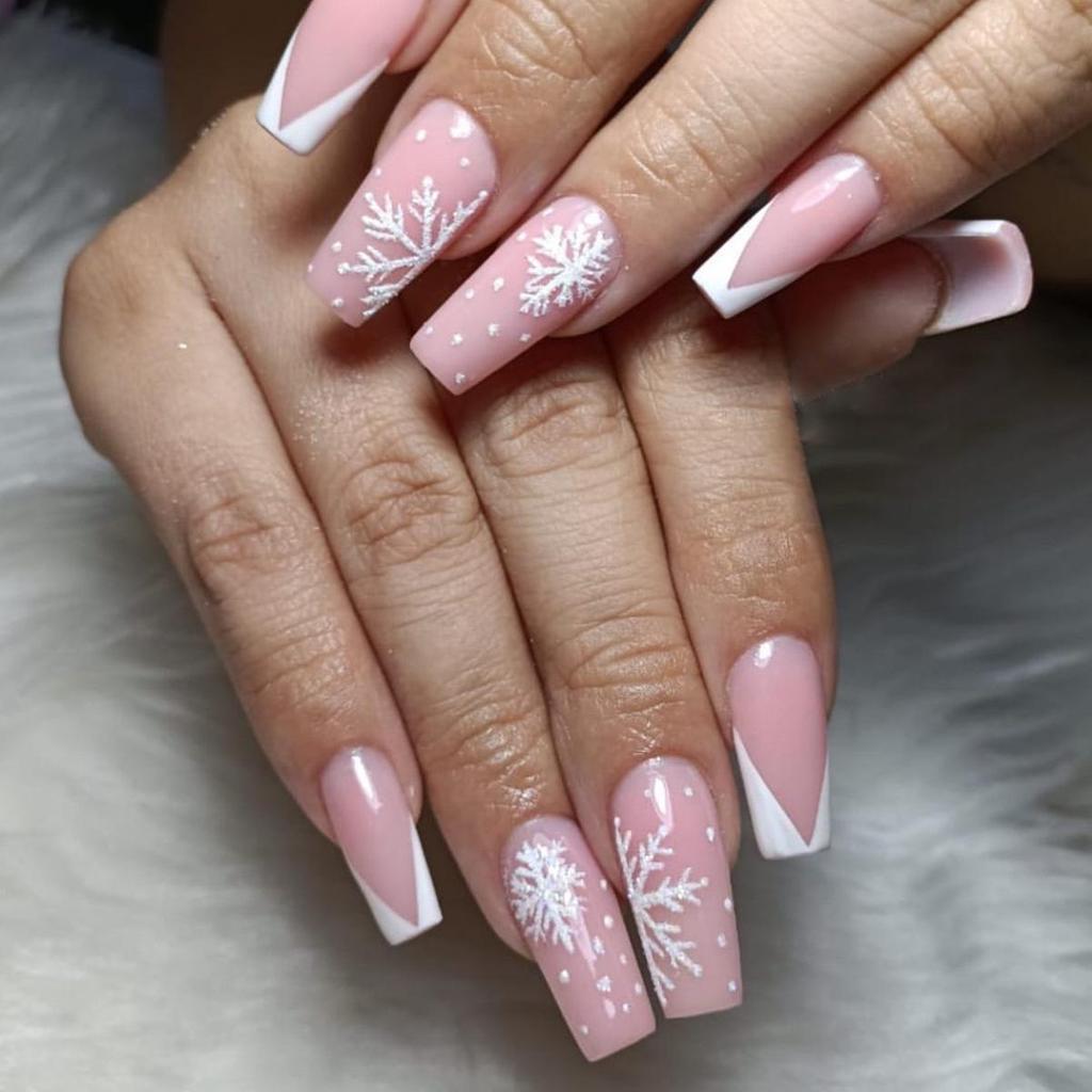 Pink French Tip Christmas Nails with Snowflakes - Removable Art Patches