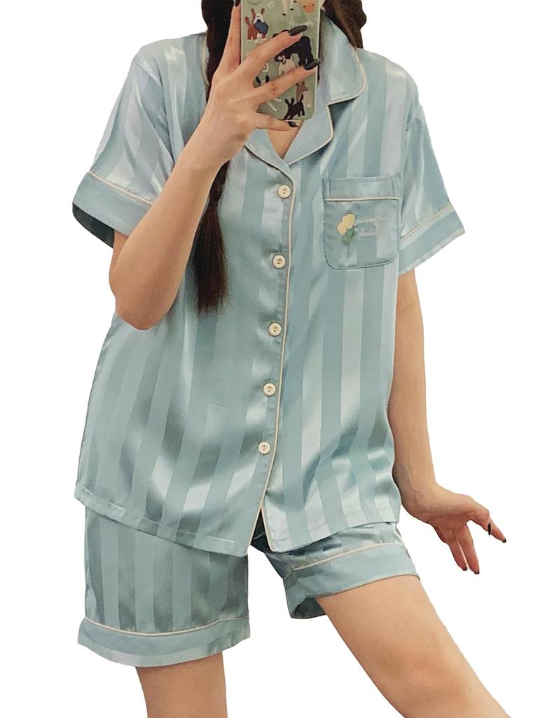 summer open short short top and bottom ice cute pajama set [PHOLEEY] Women's pajamas, loungewear, wear, front, sleeves, pants, set, silk,