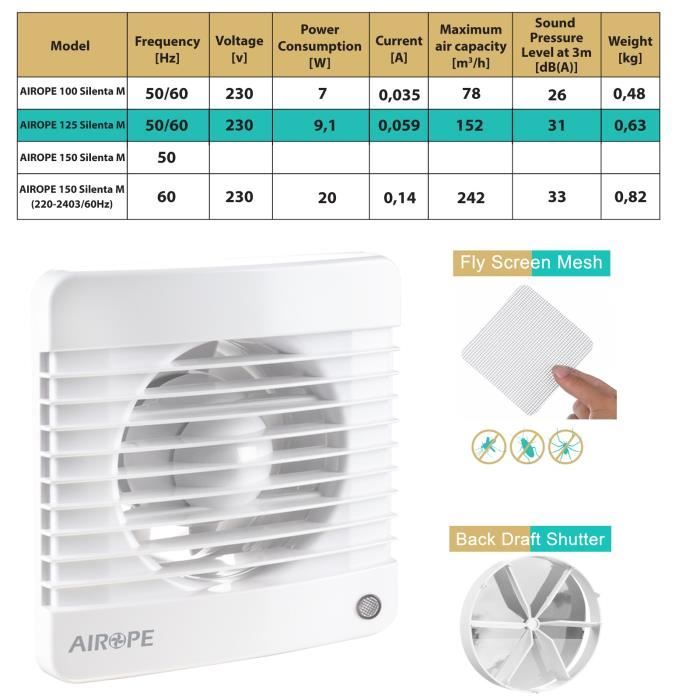 Extracteur d'air - airope - 125 mm - clapet anti-retour - moustiquaire intégré - silencieux
