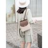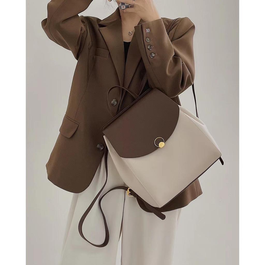 This bag has a stylish, two - tone backpack silhouette crafted from top - layer cowhide leather. It features a fold - over flap with a metal clasp, double top handles, and an adjustable shoulder strap, creating a fashionable and elegant look.
