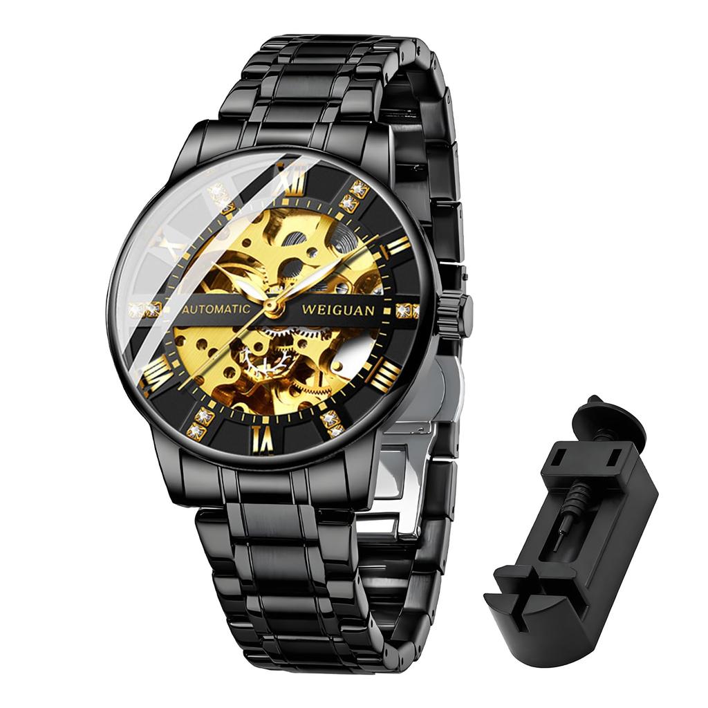 TeamSky Mechanical Automatic Mechanical Roman Stainless Large Day Gift Black Watch, Men's Watch, Steel, Waterproof, Hand-wound Watch, Numerals, Steel,