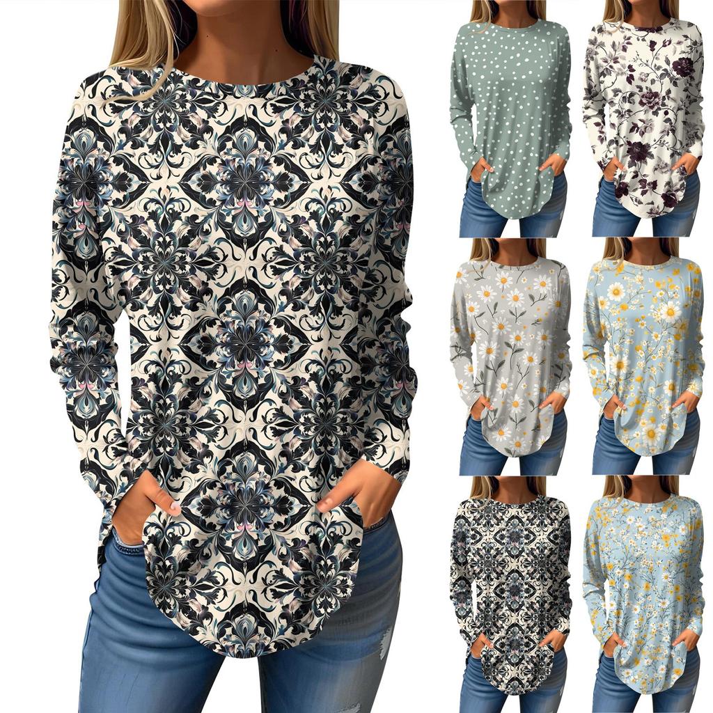 Women's Loose Casual Printed Round Neck Long Sleeved T Shirt Top Pullover Long Sleeved Sweatshirt
