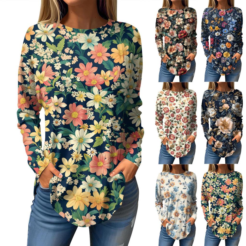 Women's Loose Casual Printed Round Neck Long Sleeved T Shirt Top Pullover Long Sleeved Sweatshirt