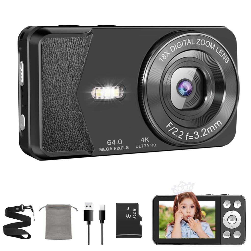 [4K & 64MP Ultra-High Resolution & Time-Lapse Recording] This digital camera supports 4K video and 64MP high-resolution photos. With 64MP ultra-high resolution, you can clearly see every detail even when enlarged. You'll feel like a professional photographer, capturing precious moments like school trips and entrance ceremonies in vivid detail. Capture distant landscapes and children's smiles with this one camera! Plus, the time-lapse function condenses the flow of a day into a few seconds, magically capturing the beauty of a sunrise or the blooming of flowers. Easy to use, even beginners can master it right away. This is the perfect camera for those who want to capture vivid, clear memories of trips and events. It also features a large 2.8-inch display. You can instantly view photos and videos you've taken, allowing you to enjoy reminiscing with family and friends.