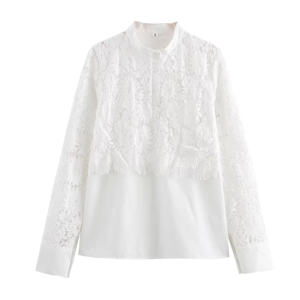 This stylish women's shirt is perfect for the 2025 spring season, offering a chic blend of European and American fashion elements. Made from high-quality polyester, this casual patchwork lace shirt features a sophisticated stand neckline and elegant long sleeves. Ideal for a variety of occasions, its lightweight and breathable design ensures comfort while maintaining a trendy appearance. Elevate your wardrobe with this versatile and fashionable staple.