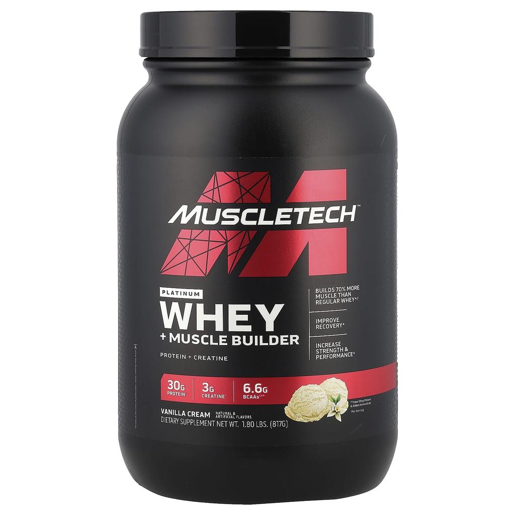 Produktbeschreibung: Baut 70% mehr Muskeln auf als normales Whey1Verbessert die ErholungSteigert Kraft & LeistungProtein + Kreatin30g Protein‡3g Kreatin‡6.6g BCAA‡**Natürliche & Künstliche AromenNahrungsergänzungsmittelDie Ultimative Molkenprotein + MuskelaufbauformelSeit unserem Durchbruch vor über 25 Jahren ist unsere Formel ein Hit bei Sportlern weltweit und wird immer noch als das leistungsstärkste Protein angesehen, das je entwickelt wurde. Whey + Muscle Builder ist unsere bisher wissenschaftlich am weitesten entwickelte Molkenproteinformel. Es wird von der am besten untersuchten Form von Kreatin angetrieben, um fettfreie Muskelmasse aufzubauen, die Kraft zu steigern und die Leistung zu verbessern.. Es das Ergebnis, jeden Tag die Grenzen von Wissenschaft und Forschung ständig zu verschieben.. Bereit, noch einen Schritt weiterzugehen? Was immer du willst, Whey + Muskelaufbau kann helfen. Außergewöhnlich—70% besser als normales Molkenprotein. Whey + Muskelaufbau ist der Höhepunkt jahrzehntelanger harter Arbeit, Patente und Investitionen in Forschung. In einer 16-wöchigen, doppelblinden Studie gewannen Probanden mit mindestens drei Jahren Gewichtstrainingserfahrung, die die Kernbestandteile in Whey + Muscle Builder einnahmen, 70 % mehr fettfreie Muskelmasse. (8,8 Pfund. vs. 5.1 lbs.) und mehr Bankdrücken (34 lbs. vs. 14 Pfund.) als Probanden, die regelmäßig Molkenprotein einnahmen. Erhöhte fettfreie Muskelmasse und Kraft bedeuten, deinen Fortschritt auf die nächste Stufe zu heben.. Kraftvolle Protein-Effekte Jeder Messlöffel Whey + Muscle Builder enthält 30 Gramm hochwertiges Molkenprotein, eines der am schnellsten wirkenden Proteine, die erhältlich sind. Gefiltert unter Verwendung mehrstufiger Filtrationstechnologie, um unerwünschte Kohlenhydrate und Fett zu entfernen. Letztendlich zählt, was drin ist.. Garantierter Geschmack Die Marke Muscle Tech® hat sich mit den weltweit führenden Aromenherstellern zusammengetan, um bei jeder Messlöffelportion Whey + Muskelaufbau eine köstlich-vergnügliche Erfahrung zu bieten.. Wenn du kurz davor bist, deine Ziele zu erreichen, versuche es. Du wirst es lieben. **Aus Molkenprotein mit zugesetzten Aminosäuren‡ Pro Portion