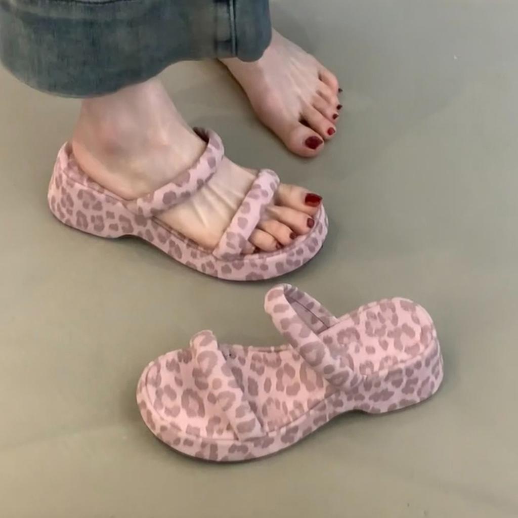 Sexy pinker Leopardenmuster Ein-Wort-Slipper Damen vielseitige dicksohlige Outdoor-Bekleidung ein Pedal zur Höhenvergrößerung Mode-Sandalen