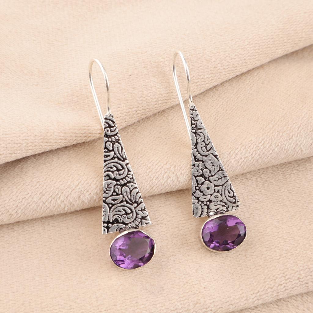 Natural Amethyst Gemstone 925 Sterling Silver Jewelry Handcrafted Earrings 1.9" EE-165-12