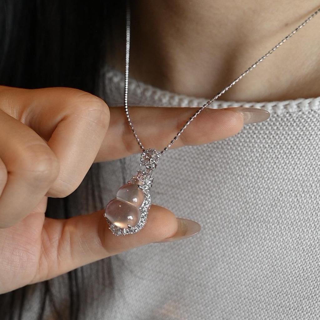 Pure Silver S925 Natural Mizzonite Jade Gourd Pendant Necklace - High Ice Variety for Women, with Chinese Style Fu Lu Charm