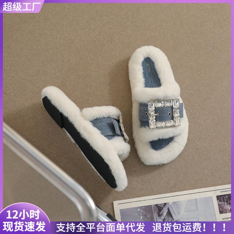 Dicksohlige flauschige Schuhe, die Frauen im Herbst und Winter tragen, Plüsch-Internet-Berühmtheit, Strass-Jeansblau, Plüschpantoffeln
