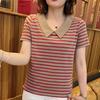 Gestreiftes kurzärmeliges T-Shirt im Sommer Neues lockeres Bauchbedeckendes Puppenkragen-Oberteil Altersmilderndes Halbarmhemd