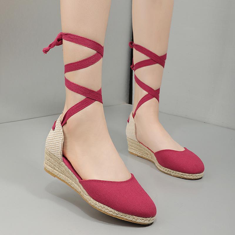 2025 neue Stroh-Sandalen mit hohen Absätzen Sommer Riemchen hohe Absätze Hanfsohle Schuhe zum Schnüren Hanfseil Keilabsatzschuhe