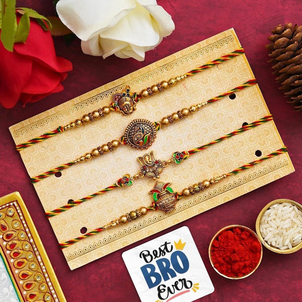 Set aus 4 Designer-Rakhis mit Lord Ganesha, Pfau, Krishna & Kalash, mit Roli-Chawal-Packung und Best Bro Ever Kühlschrankmagnet - Rakhi für Bruder