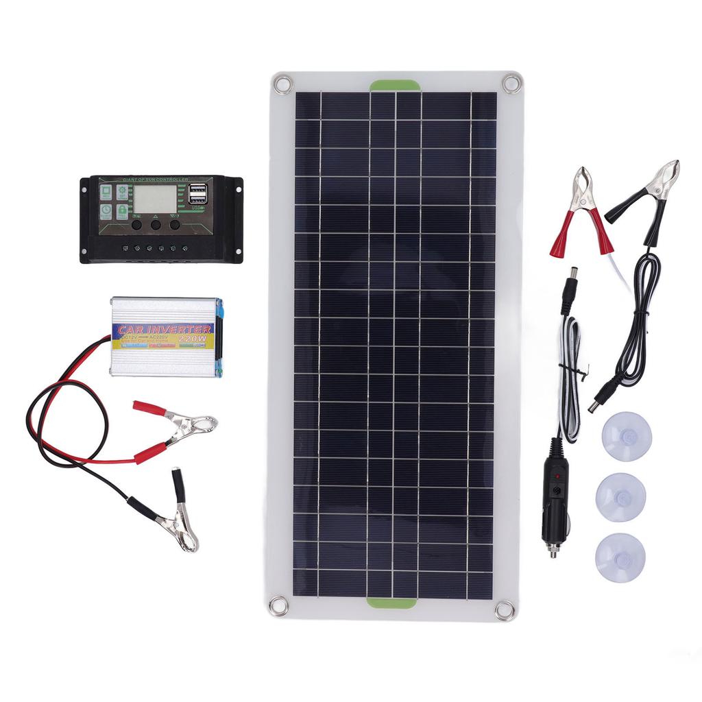 5. Packungsinhalt: Das Paket enthält 30W Solarpanel, 10A Regler, 220W Wechselrichter, Batterieklemme, 4 Saugknöpfe und Zigarettenanzünderkabel zur Batterieladung.