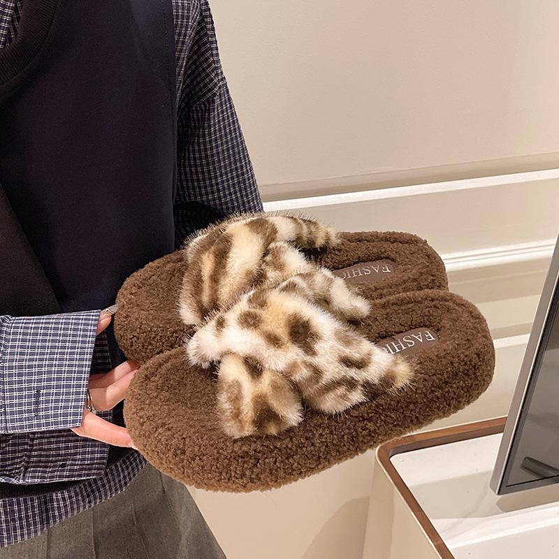 Kleine dicksohlige Plüschpantoffeln mit Leopardenmuster für Damen zum Tragen im Freien Herbst und Winter neue Ein-Wort-Plüschpantoffeln