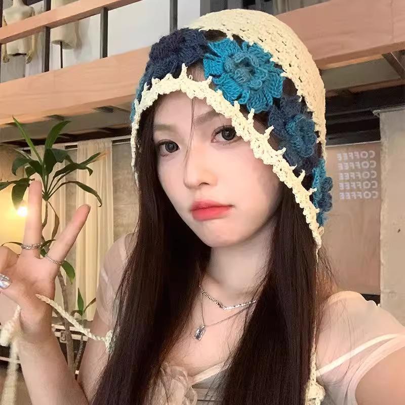 Frühlings- und Sommerliterarische und farbenfrohe Blumen hohler Kopfschmuck weiblich süß und niedlich Mode handgefertigte Wollstrickmütze
