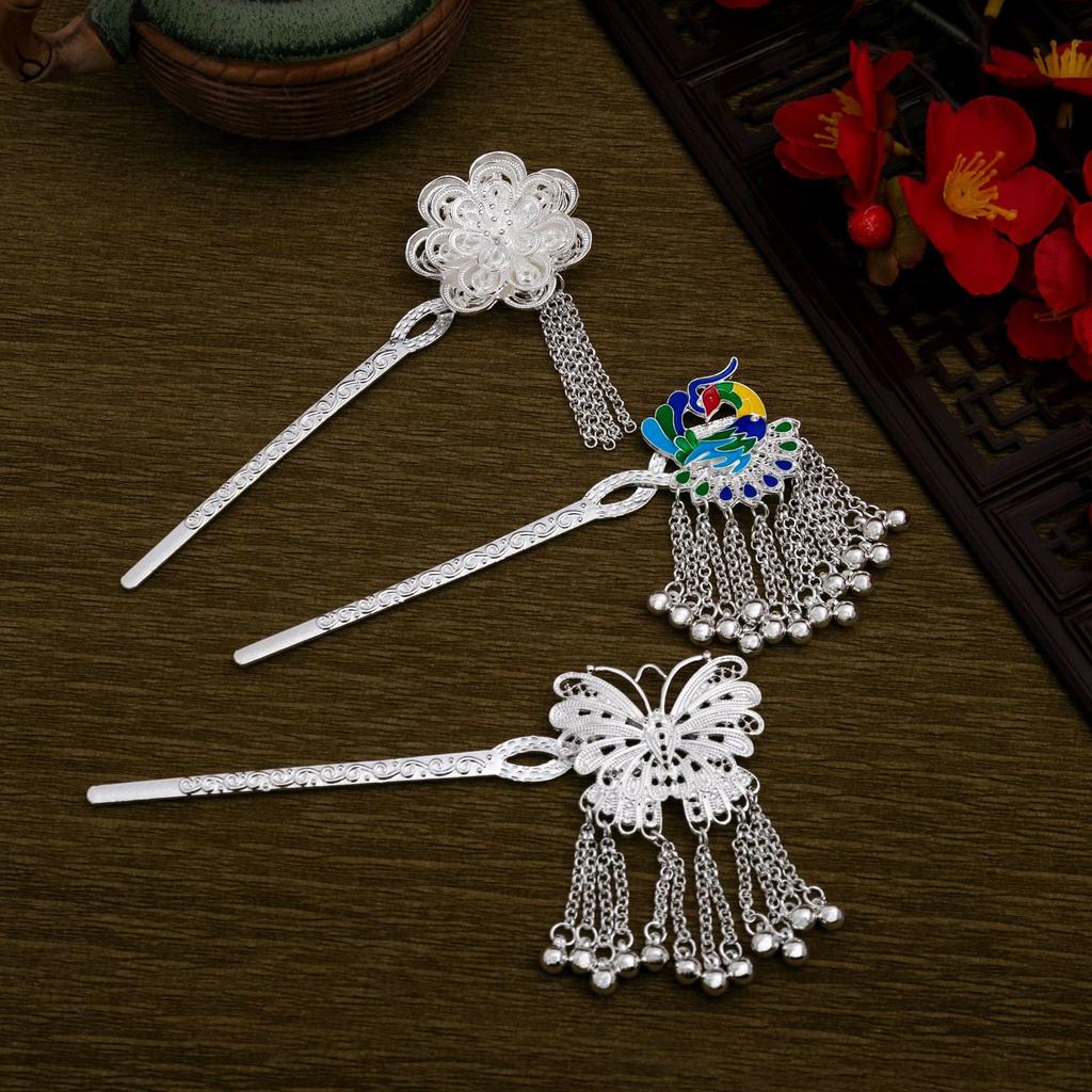 Ethnischer Stil Imitation Miao Silber Bunt Tropföl Pfau Haarnadel Retro Touristenattraktionen Schmetterling Blumen Stufen-Schüttler Haarnadel Damen