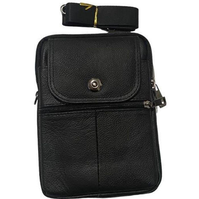 Sacoche Homme Cuir - Besace Pochette - Sac Bandouliére - Noir - Fermeture Eclaire Multipoche -Poche Bouton -Rengeur Documents