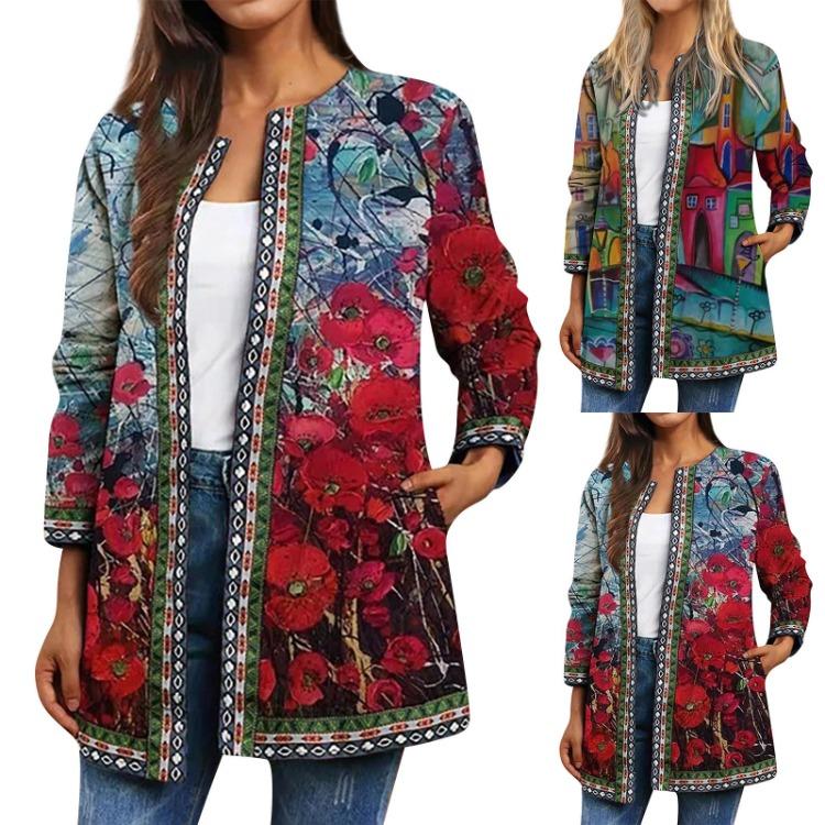 Damenmode Vintage Ethno-Print Langarm Strickjacke Jacke Oberteil