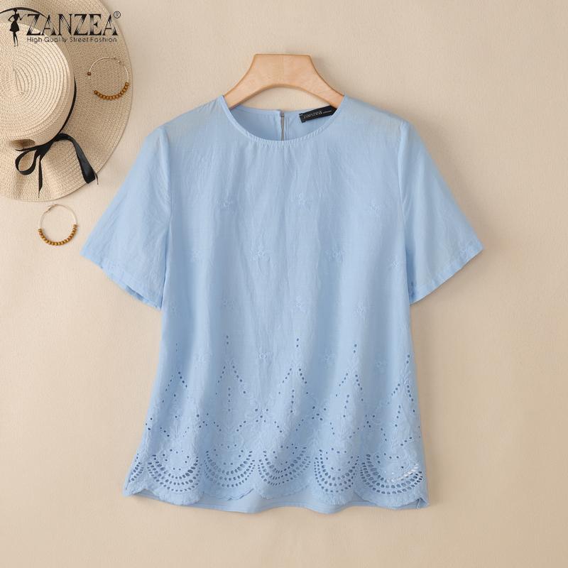 ZANZEA Damen Sommer Stickerei Lässig Rundhals Kurzarm T-Shirts