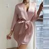 Pyjamas Damen Einfarbig Satin Nachtmantel Langarm V-Ausschnitt Morgenmantel mit Gürtel Damen Nachtwäsche