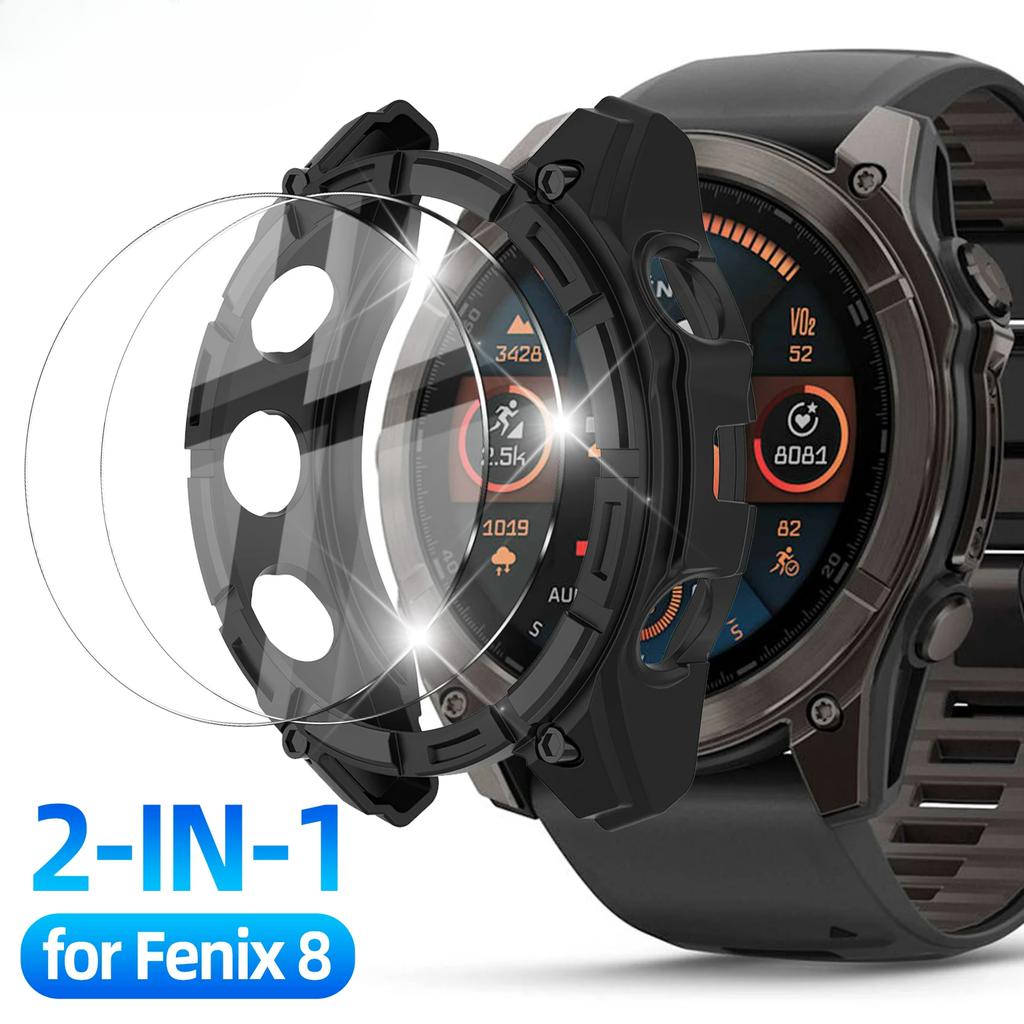 2-IN-1 Glas+Hülle für Garmin Fenix 8 51/47/43mm AMOLED Solar Displayschutzfolie Gehärtetes Glas+Bumper Schutzhülle Zubehör