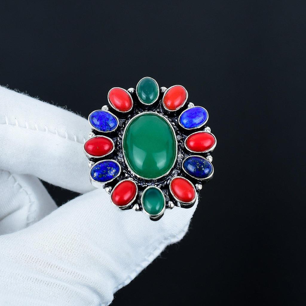 Grüner Onyx, Lapislazuli, Rote Koralle Handgefertigt 925 Sterlingsilber Verstellbarer Ring