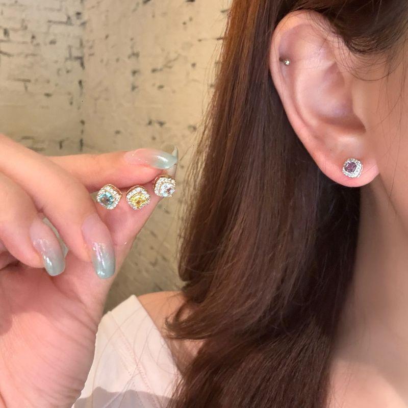 [Peach Tea] All-Match Self-Retention Style! Flash Exquisite Silver Needle Small Square Sugar Zircon Ear Studs High Sense Earrings Women