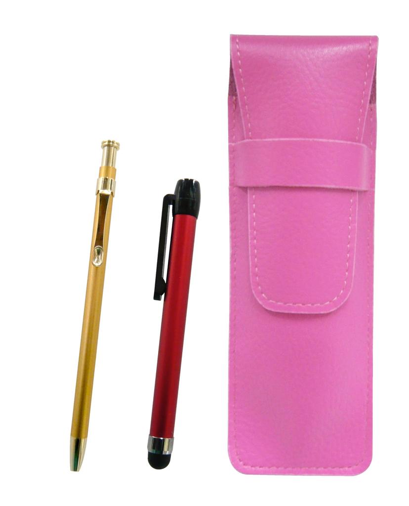 Pink grained leather pen case with red metal touch stick and slim 60 gold ballpoint pen set (SASP-ALR-SV60KBP)