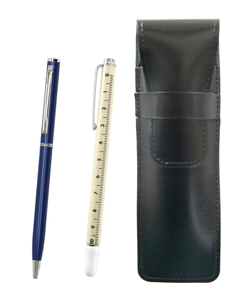 Slim black leather pen case with slide measuring stick and slim rotating ballpoint pen set (blue) ASB-708W-PD04-L