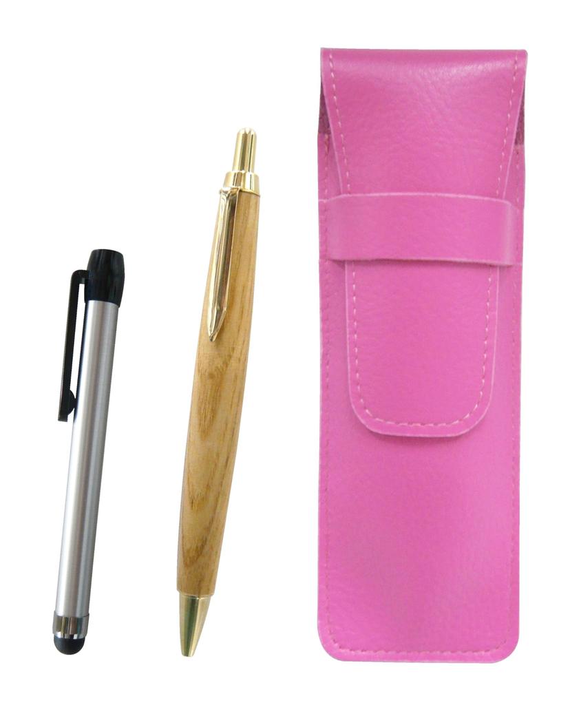 Pink grained leather pen case with a silver pen and a retro maple wood shaft ballpoint pen set metal-touch (SASP-ALST-HS47S)