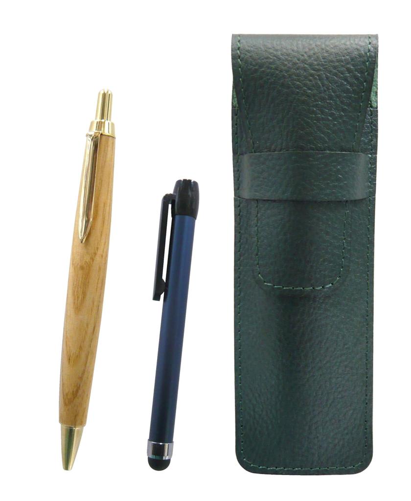 Moss green grained leather pen case with blue pen and retro maple wood ballpoint pen set metal-touch (SASM-ALL-HS47S)