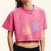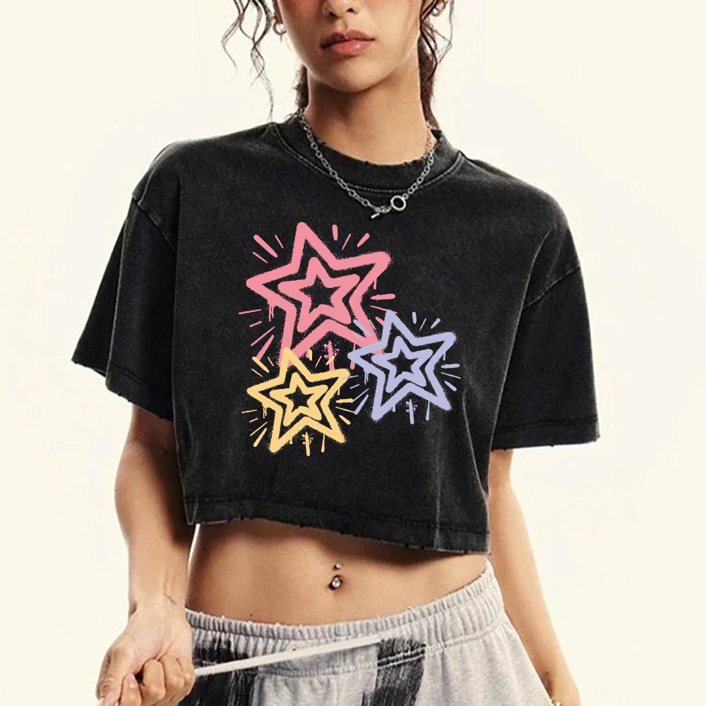 Buntes Sterne Persönlichkeitsdruck Snow Wash T-Shirt Damen Lässig Baumwolle Gewaschenes T-Shirt Weich Retro Kurzarm Top