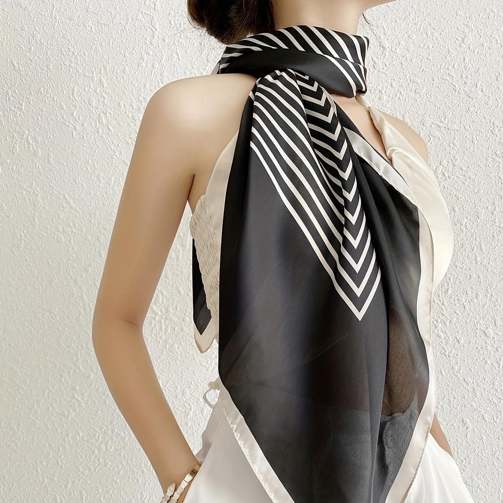 35.43" Black/White Striped Square Scarf, Elegant Simulated Silk Thin Shawl, Casual Sunscreen Windproof Head Wrap For Women