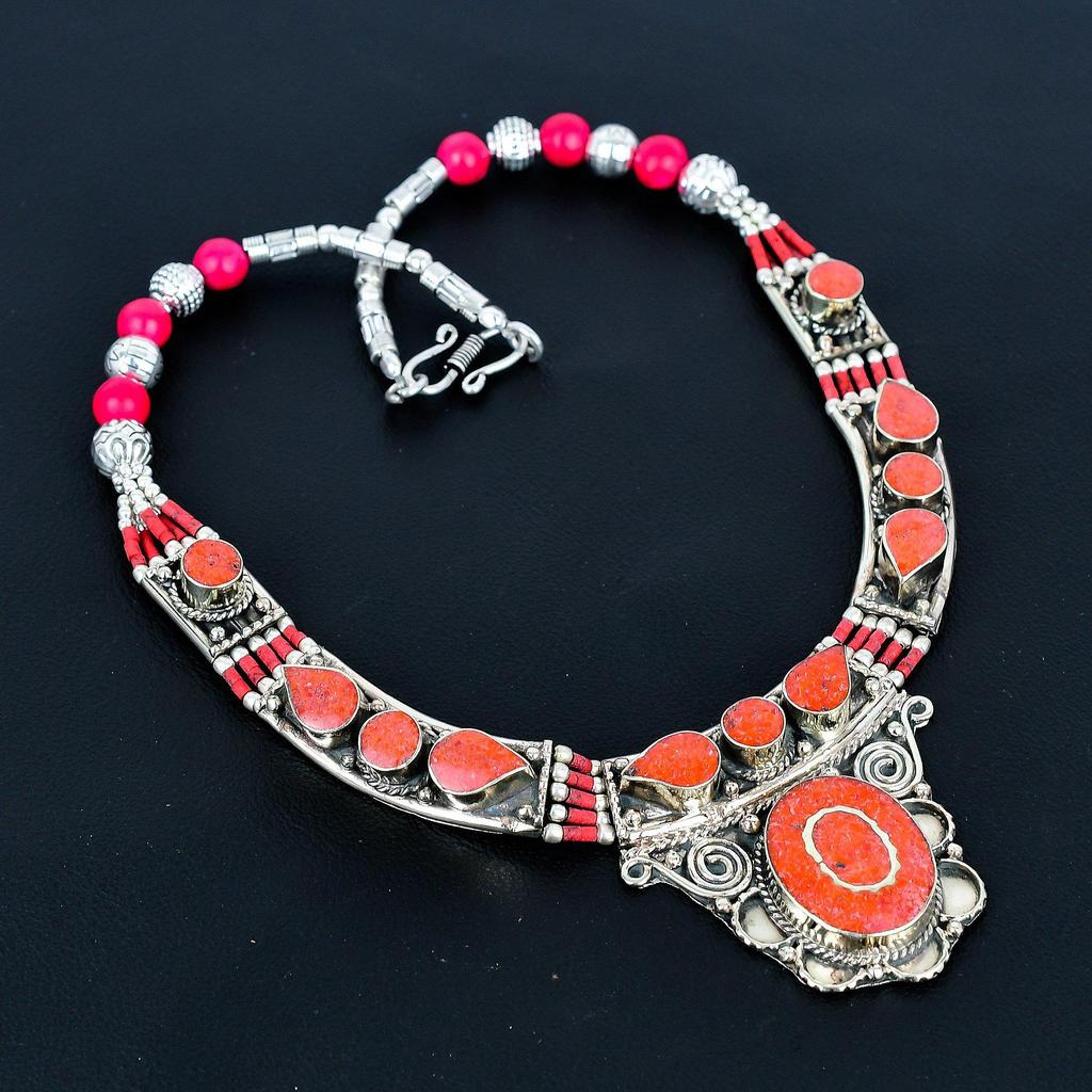 Rote Koralle 925 Sterlingsilber Halskette Tibetische Silber Halskette Böhmische Antike Halskette Handgefertigter Schmuck Nepalesische Halskette Geschenk für Ehefrau