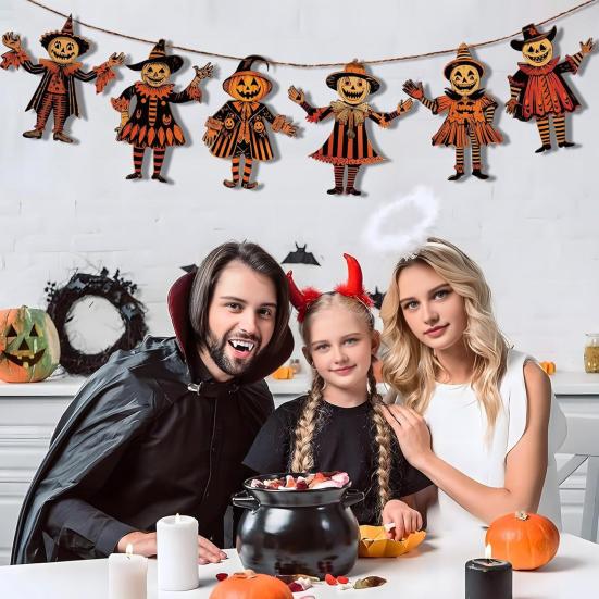 Mit seinen Retro-Farben und seinem Design verleiht dieses Banner Ihren Dekorationen eine unheimliche und doch nostalgische Atmosphäre.. Einfach zu installieren und vielseitig, kann es in verschiedenen Räumen wie Veranden, Wohnzimmern, Gärten und mehr verwendet werden.. Erhöhen Sie Ihre Halloween-Atmosphäre mit diesem und festlichen Ornament!